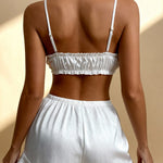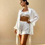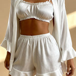 The Angie set consists of a ruffled top, frill shorts, and a matching flowing kimono.