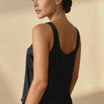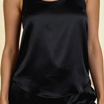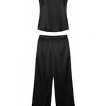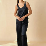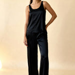 The Eden satin pyjama embodies minimalist elegance with its timeless black hue and clean lines. The round-neck tank top and racerback design provide a fluid and relaxed fit, while the wide-leg trousers with an elasticated waistband glide over the legs with complete freedom. Crafted from luxurious satin that caresses the skin, this black pyjama set combines understated sophistication with optimal comfort. Perfect for restful nights or stylish moments of relaxation, it transcends the seasons with a modern and timeless appeal.