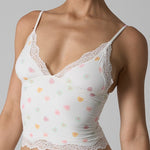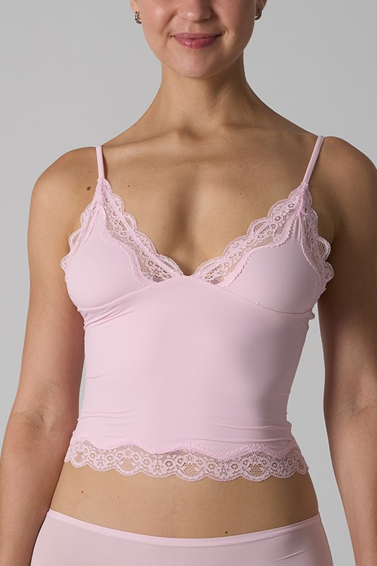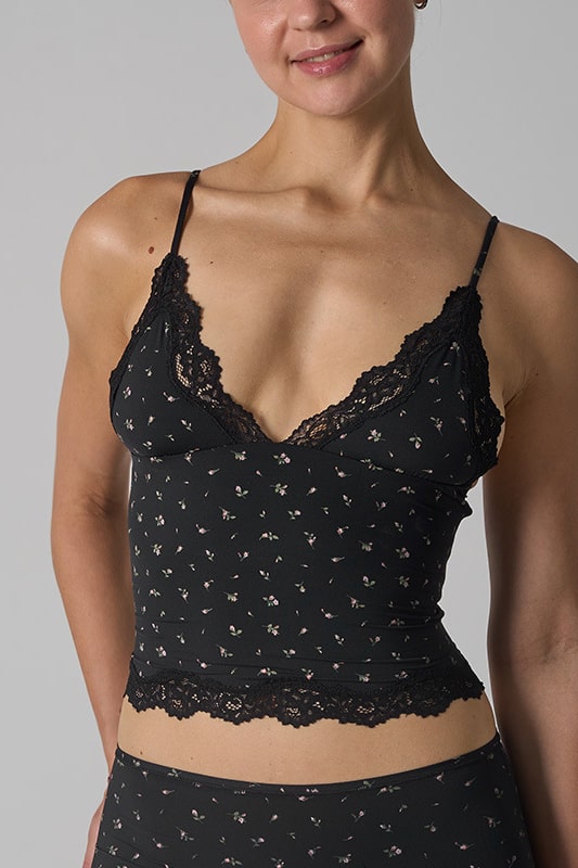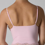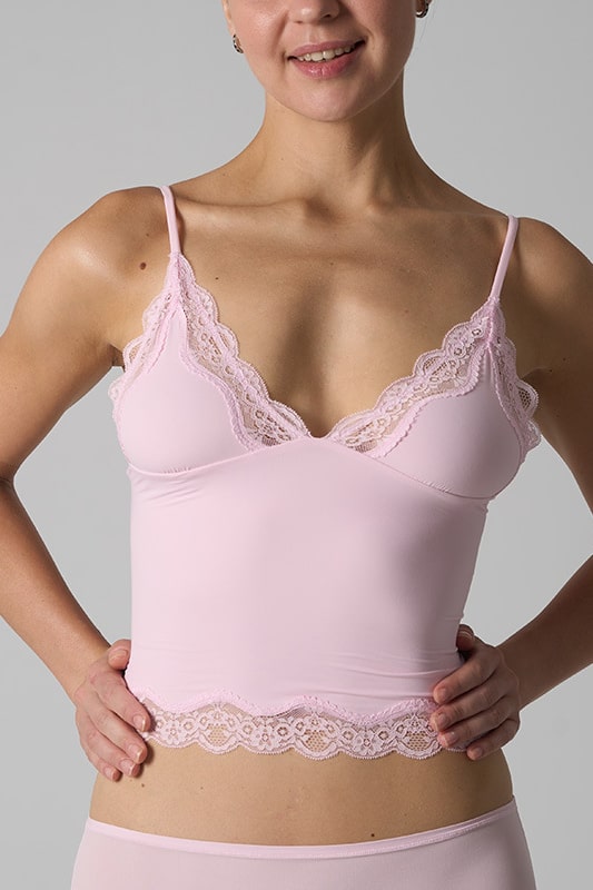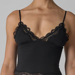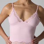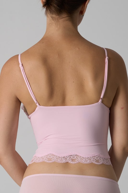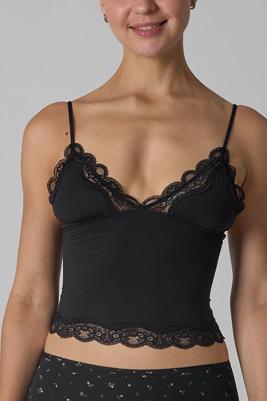 A delicate and feminine tank top designed to blend comfort and sensuality. Its body-hugging cut is highlighted by fine lace at the neckline and hem, adding a romantic touch. The straps are thin and adjustable, providing support suitable for all body shapes.