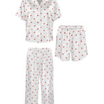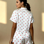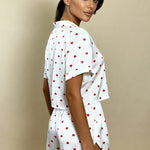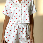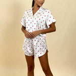 The Romy 3-piece pyjama captivates with its red heart print on a pristine white background. This complete set includes a short shirt with a tailored collar, rounded-edge shorts, and matching long trousers to suit all preferences. Crafted from lightweight and soft satin, it glides delicately over the skin while offering total freedom of movement. The rolled-up short sleeves and fluid cut create a relaxed and feminine look. Perfect for mixing and matching pieces according to the seasons or your mood.