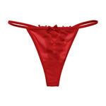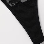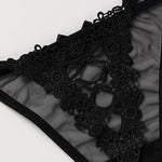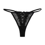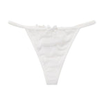 A sensual and minimalist string, designed to play with transparency. Its front is made of tulle, adorned with delicate floral lace and a small satin bow, while its string back highlights the curves without leaving marks under clothing. Light, discreet, and ultra-sexy.