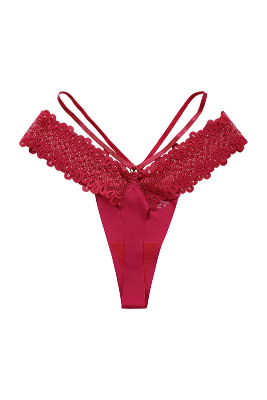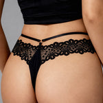 An alluring string that combines a daring cut with delicate crossover bands to enhance the hips. Its floral lace adds an elegant and sensual touch, while the double straps and central ring provide a bold and modern note.